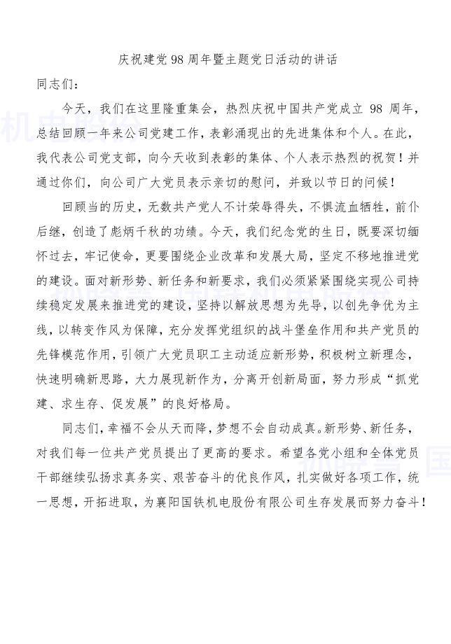 今年是建黨98周年?!捌咭弧鼻昂?,襄陽國鐵機電股份有限公司開展了豐富多彩的紀(jì)念活動,以傳承紅色基因、弘揚革命精神,不忘初心、牢記使命,矢志為中華民族偉大復(fù)興中國夢努力奮斗。