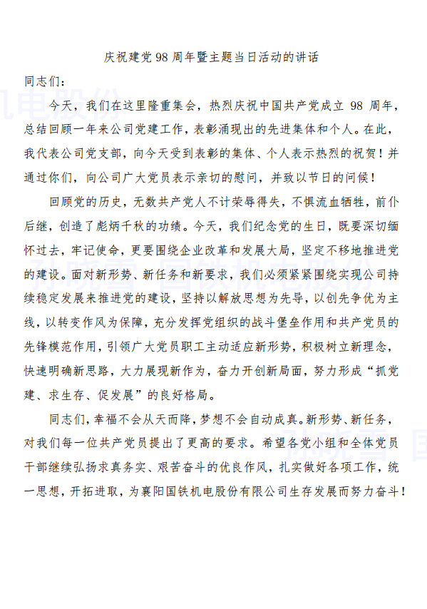 今年是建黨98周年。7月1日,襄陽(yáng)國(guó)鐵機(jī)電股份有限公司以傳承紅色基因、弘揚(yáng)革命精神展開(kāi)了紀(jì)念活動(dòng)。
