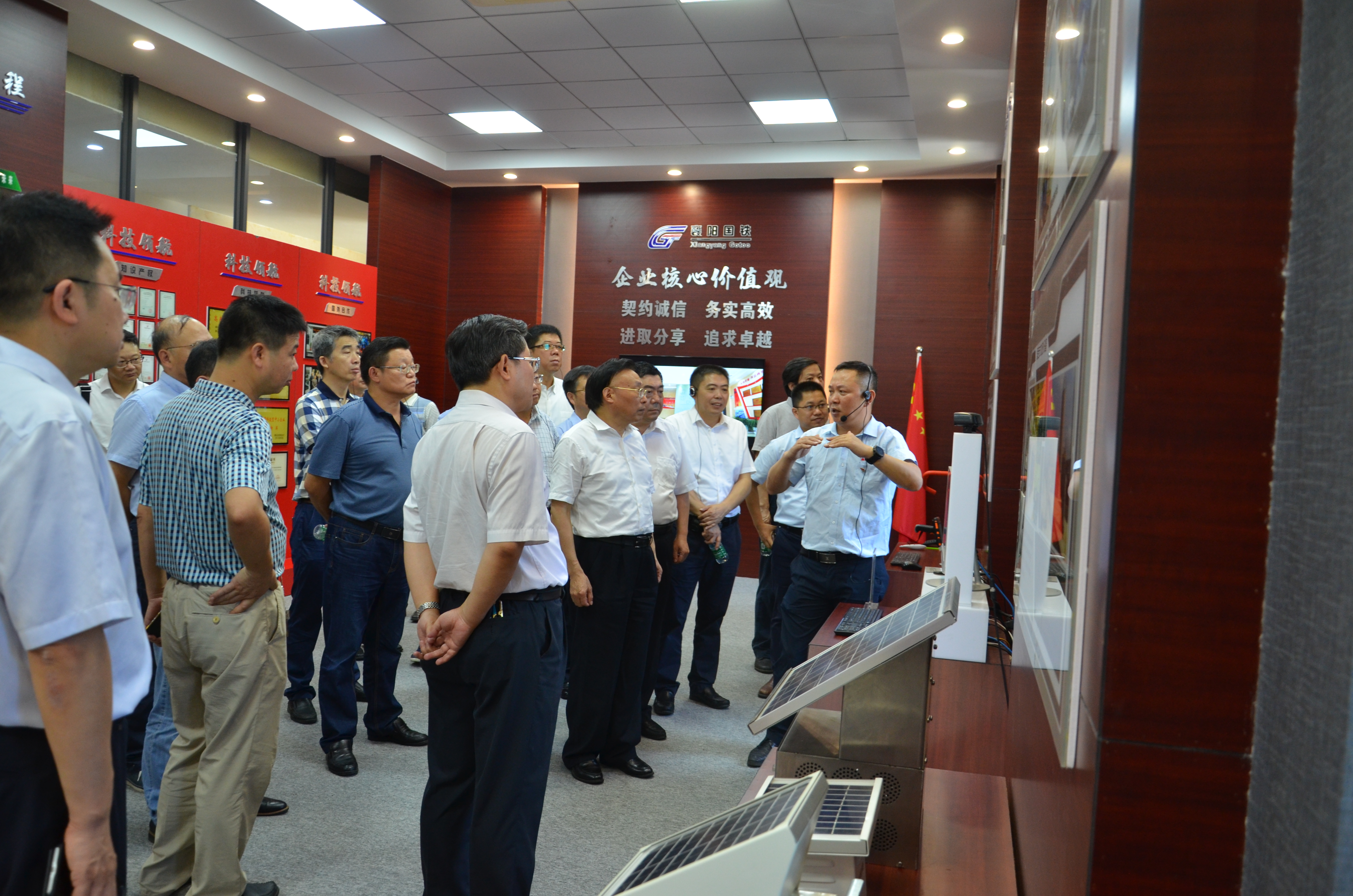 張清杰校長(zhǎng)、李德璋副市長(zhǎng)等一行首先參觀了公司展廳,曾建勇董事長(zhǎng)介紹了公司“產(chǎn)品創(chuàng)新”、“國(guó)際合作”、“企業(yè)文化”等方面的情況。張清杰校長(zhǎng)對(duì)我公司自主研發(fā)的“軌道交通信息化管理系統(tǒng)”給予了高度的贊賞,李德璋副市長(zhǎng)稱(chēng)贊襄陽(yáng)國(guó)鐵是一家勇于創(chuàng)新的優(yōu)秀企業(yè),鼓勵(lì)公司繼續(xù)加強(qiáng)技術(shù)儲(chǔ)備,帶動(dòng)全市軌道交通產(chǎn)業(yè)的發(fā)展。