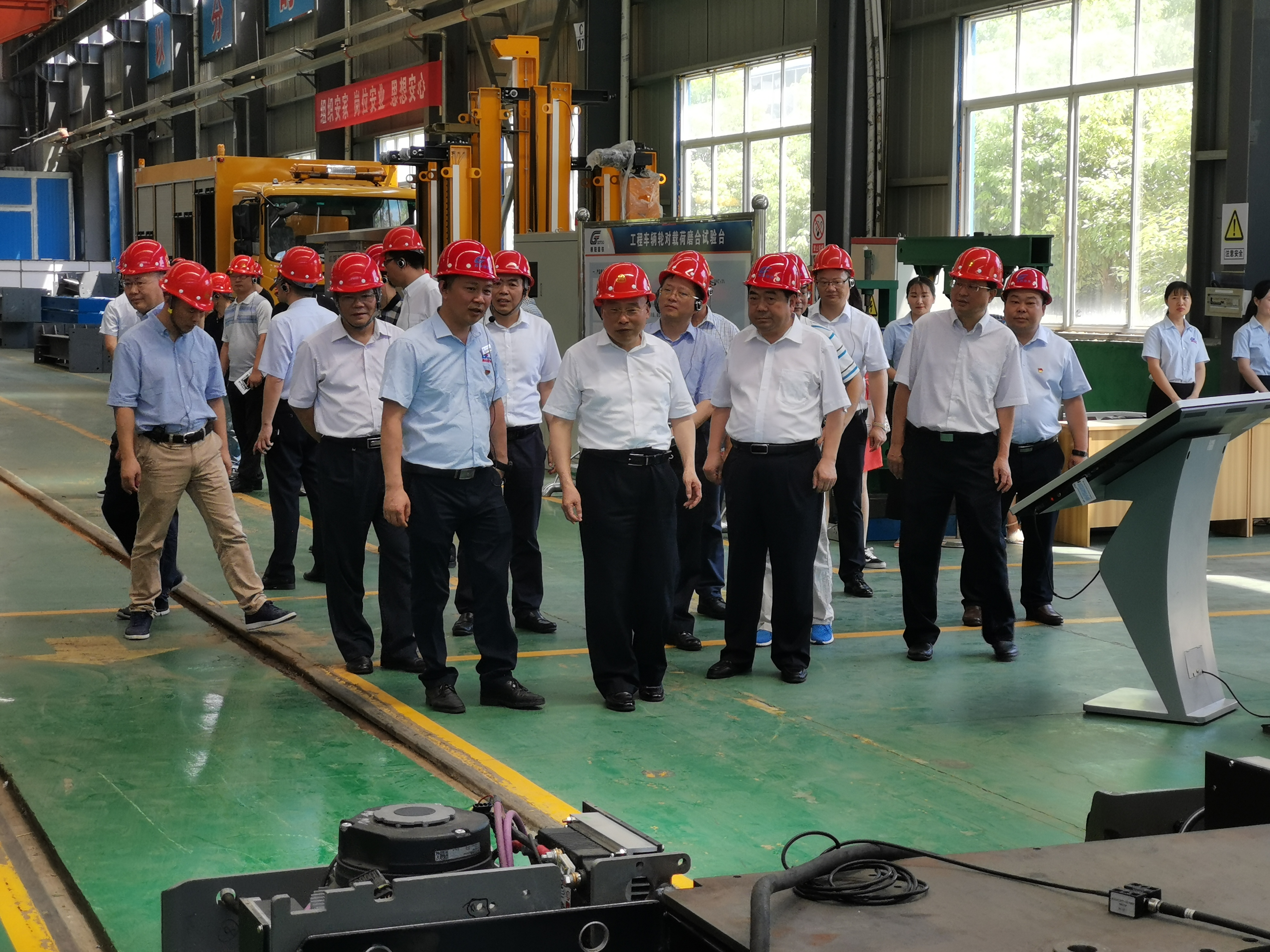 張清杰校長(zhǎng)、李德璋副市長(zhǎng)等一行走出展廳步入生產(chǎn)車(chē)間,邊走邊看,不時(shí)詢(xún)問(wèn)生產(chǎn)操作人員和技術(shù)人員,在新產(chǎn)品研發(fā)車(chē)間參觀了“輪對(duì)、受電弓在線激光檢測(cè)系統(tǒng)”、“公鐵兩用車(chē)”等創(chuàng)新產(chǎn)品。
