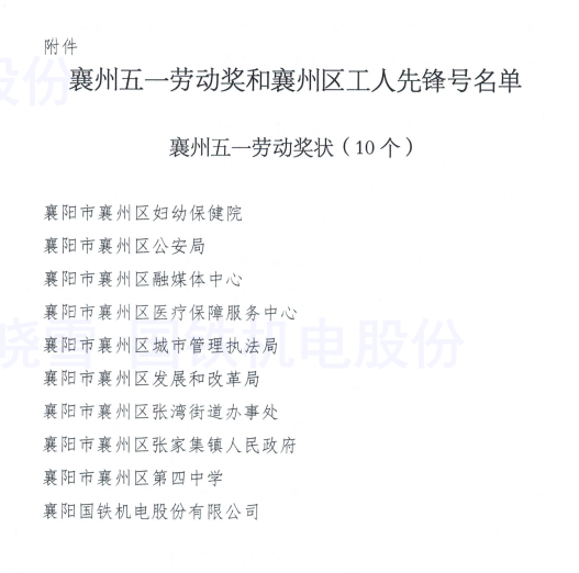 熱烈祝賀:襄陽國鐵機(jī)電股份有限公司被襄州區(qū)總工會授予五一勞動獎狀、襄陽國鐵機(jī)電股份有限公司曾建勇勞模創(chuàng)新工作室被襄陽市總工會和襄州區(qū)總工會授予職工(勞模、工匠)創(chuàng)新工作室!